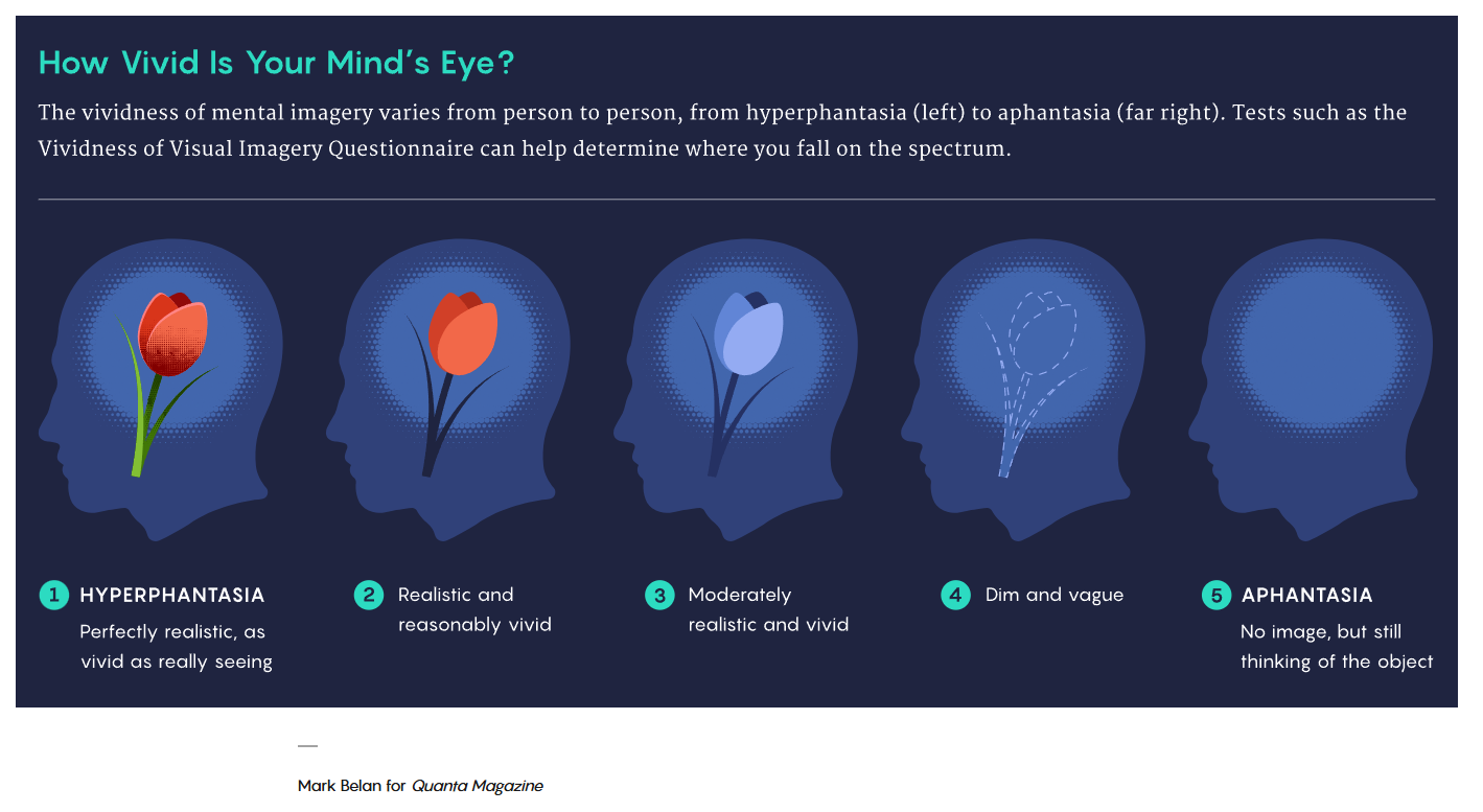 Téngase en cuenta que esto no quiere decir que no pueda imaginar, sino más bien que mi imaginación y mis recuerdos son más conceptuales y emocionales. Consisten en pensamientos, sentimientos y sensaciones más que en imágenes.